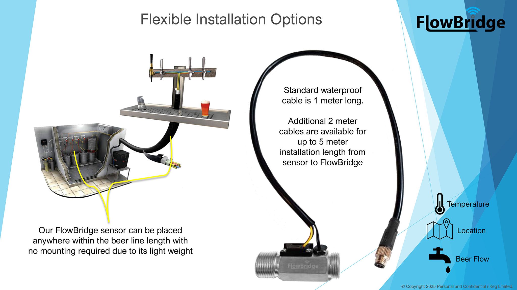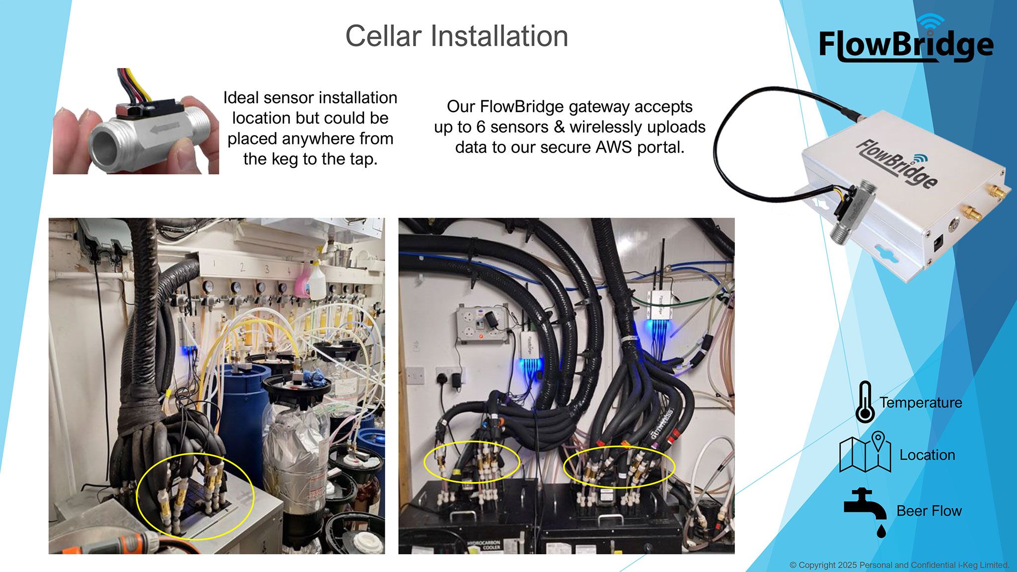 Designed for demanding cellar and on-trade environments, the FlowBridge system uses in-line flow and temperature sensors with IP65 waterproof cabling and connectors, housed through an industrial grade metal enclosure for reliable use in wet or harsh conditions. Each sensor can be positioned flexibly anywhere between the keg and tap, with no mounting required due to its lightweight construction and standard one metre waterproof cabling, with extended cable options available for longer installation runs. Hourly poured temperature readings help ensure beer is served correctly, while anomalies can be identified for corrective action, protecting product quality, reducing waste and supporting a consistently better customer experience.