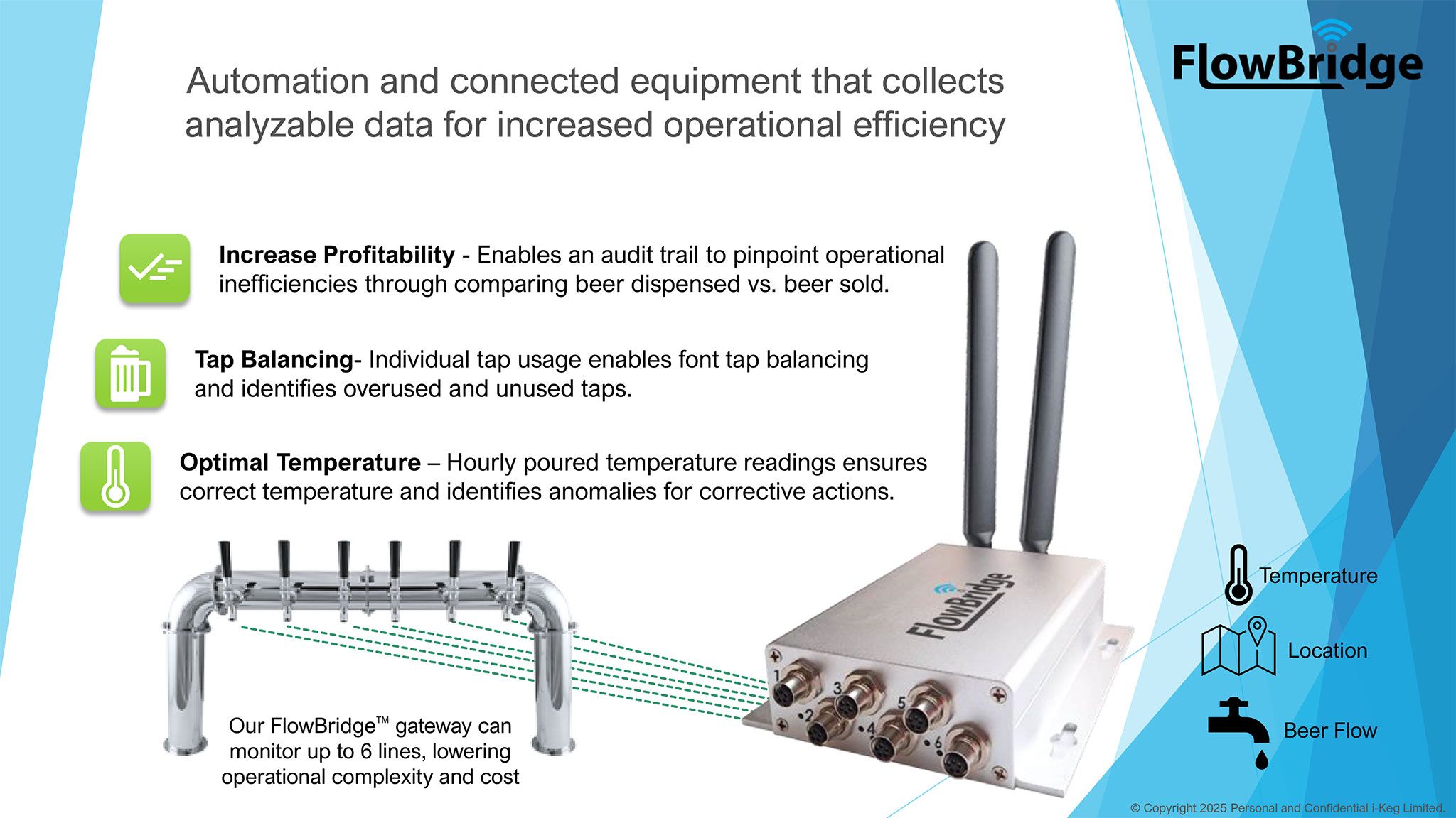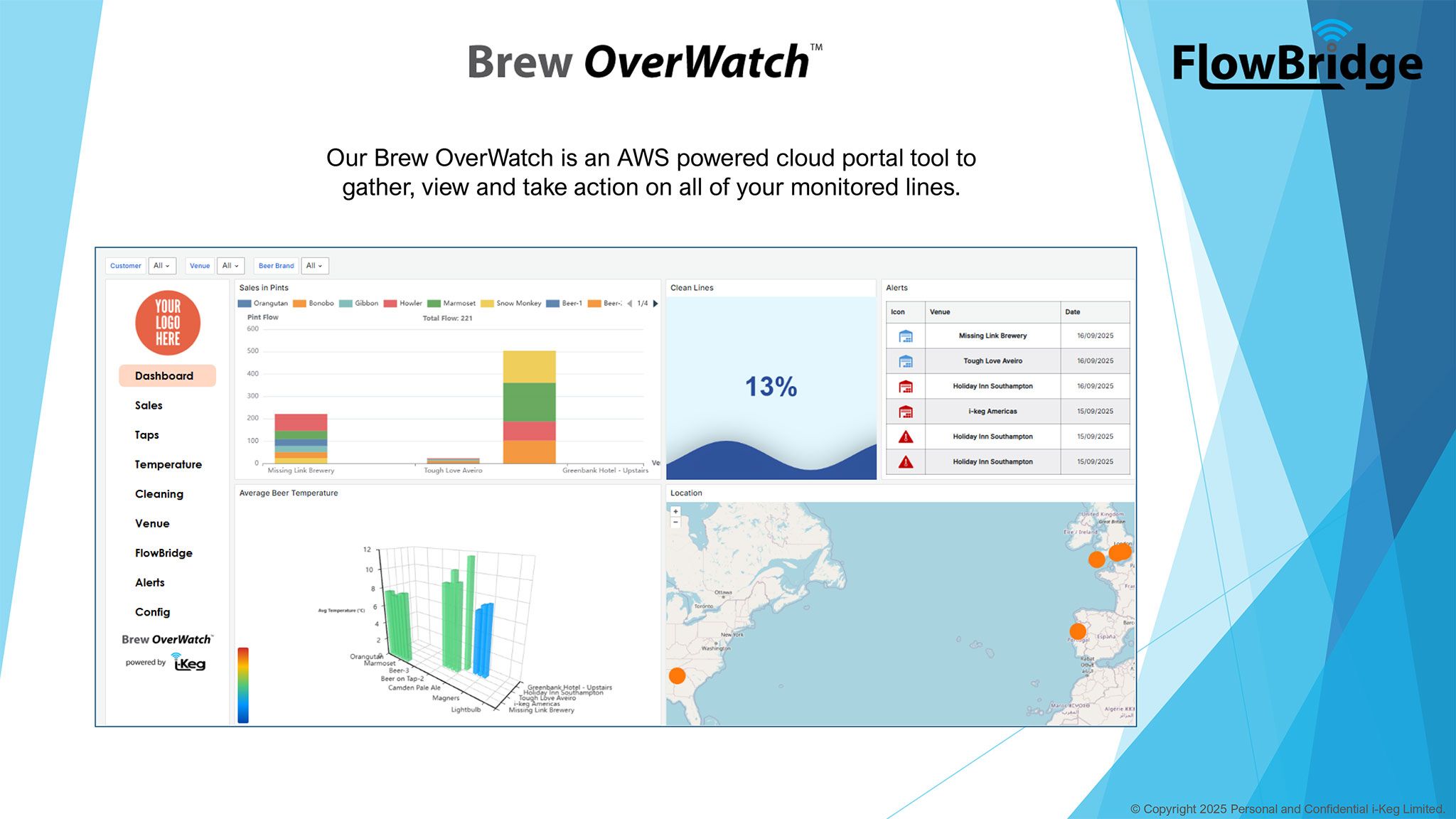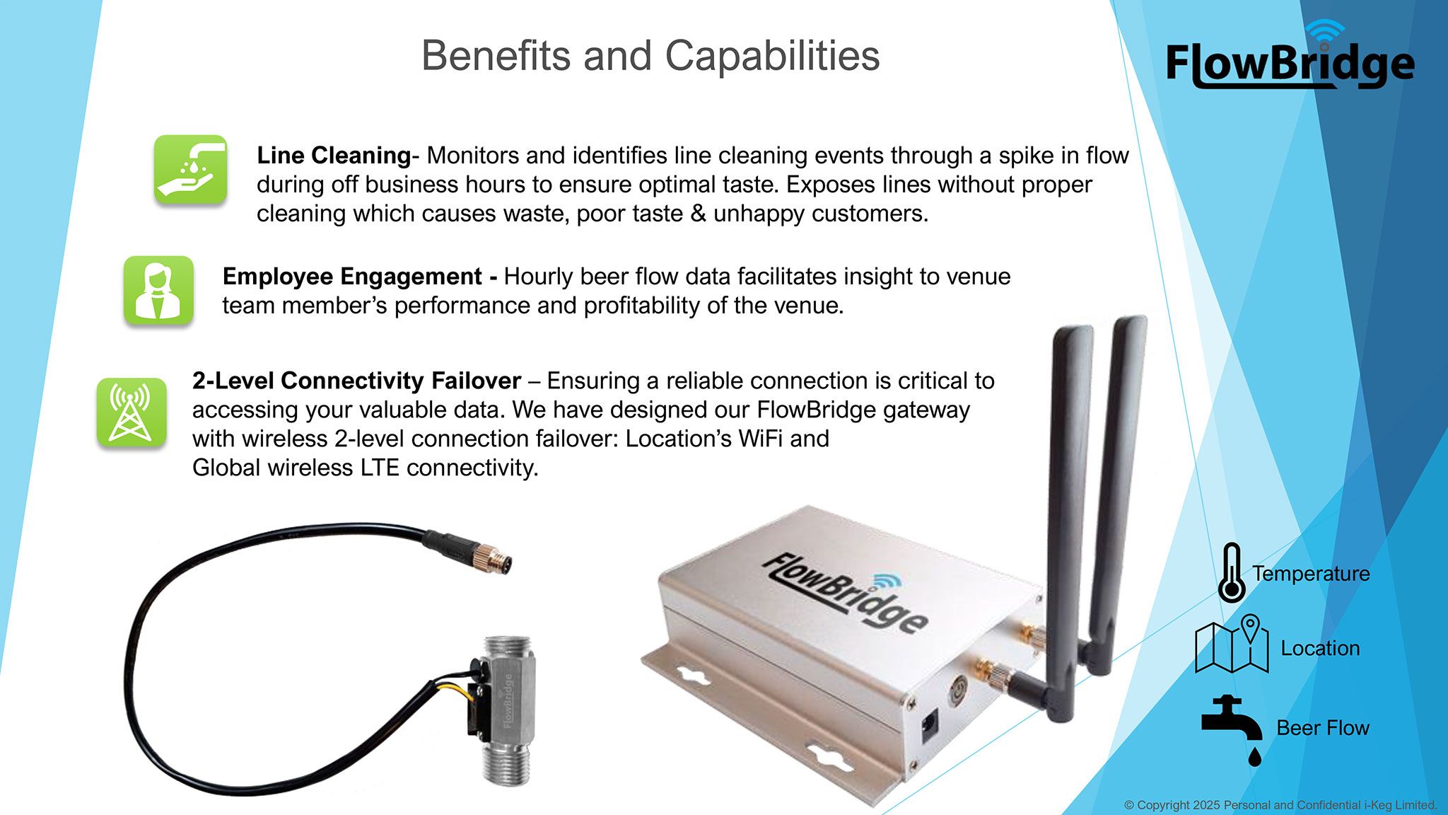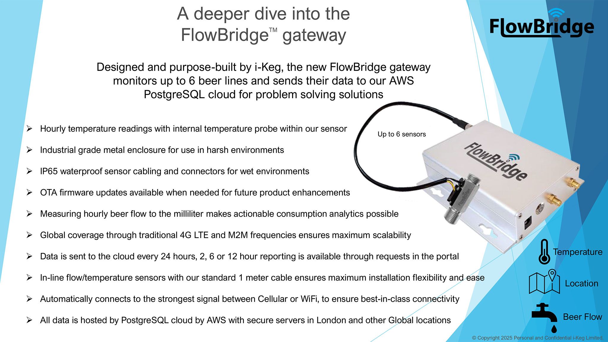 The FlowBridge gateway is a purpose built monitoring solution from i-Keg, designed to collect live operational data from beer lines and turn it into clear, actionable insight through our Brew OverWatch cloud portal. Monitoring up to six lines from a single gateway, FlowBridge records beer flow, temperature and location data, helping operators compare beer dispensed against beer sold, identify inefficiencies and improve profitability across each venue. With hourly flow readings measured to the millilitre, individual tap usage can be reviewed to support tap balancing, highlight overused or unused fonts and provide a clearer understanding of team performance, product movement and venue profitability.